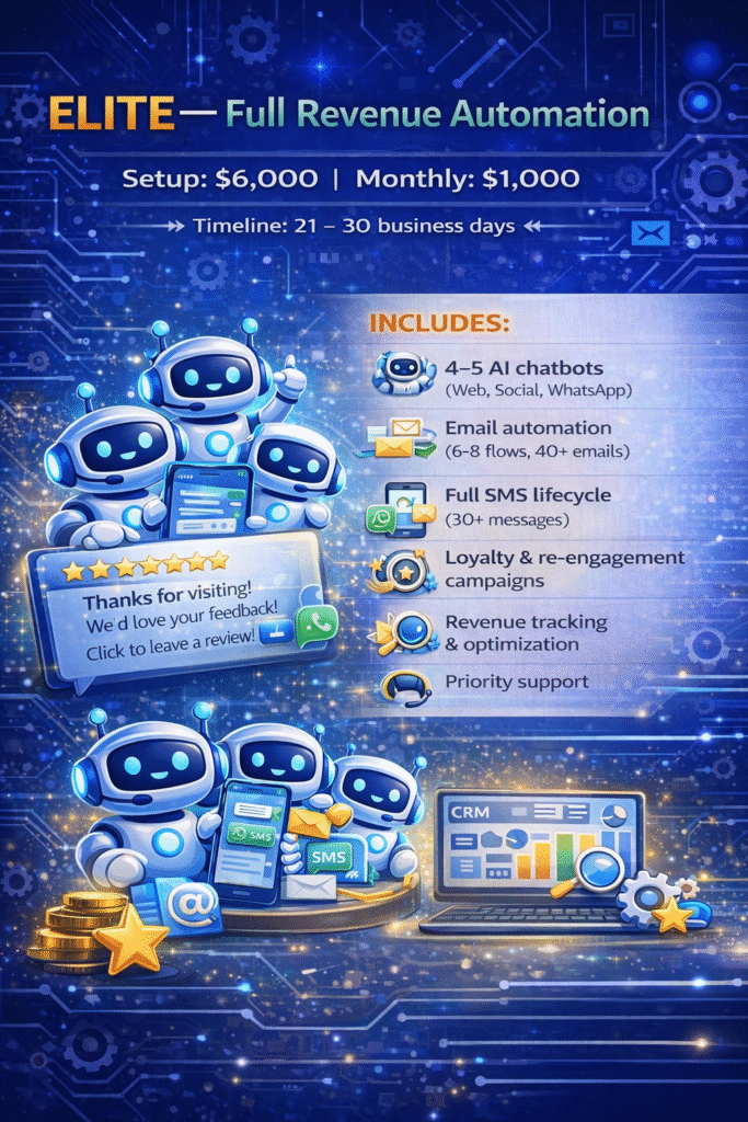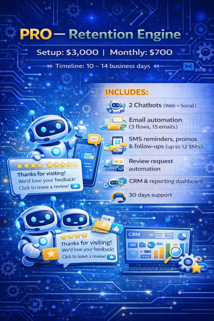 Email + Bot + SMS Packages PRO – Retention Engine Was Now $700 / mo Sale $3,000 Setup Timeline: 10 – 14 business daysIncludes:2 Chatbots (Web + Social)Email automation (3 flows, 15 emails)SMS reminders, promos & follow-ups (up to 12 SMS)Review request automationCRM & reporting dashboard30 days support Quantity Enter an amount $ Add to Cart You may also like Sale Email + Bot + SMS Packages ELITE – Full Revenue Automation $1,000 Sale Email + Bot + SMS Packages BASIC – Smart Follow-Up System $400